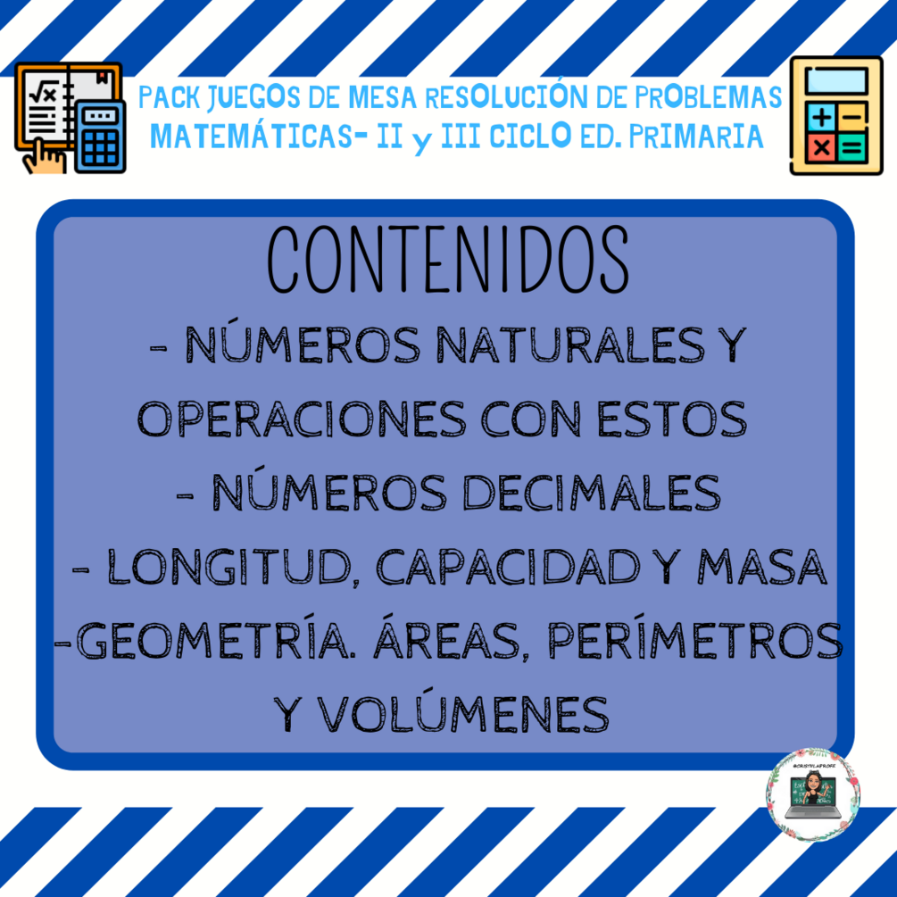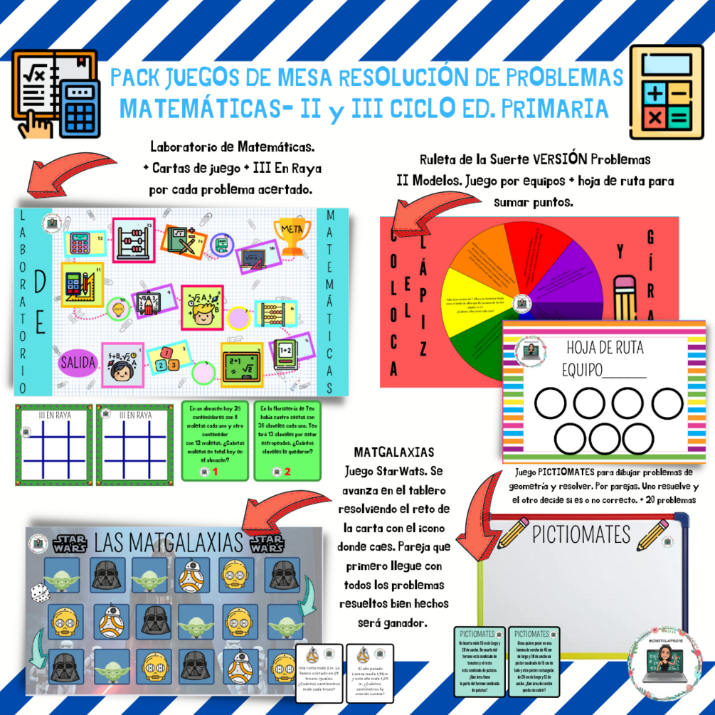 En el día de hoy te traigo IV juegos de mesa para trabajar en tus sesiones de #matematicas la #resoluciondeproblemas a través de los juegos de mesa. ¿QUÉ CONTENIDOS TRABAJAREMOS? 1. Nº NATURALES Y OPERACIONES CON ESTOS 2º. NÚMEROS DECIMALES 3º. LONGITUD, CAPACIDAD Y MASA 4º. GEOMETRÍA. ÁREAS, PERÍMETROS Y VOLÚMENES El pack contiene los siguientes materiales: 1. El laboratorio de las Mates. Los alumnos avanzarán en tablero y deberán resolver el problema indicado a través de un nº en el tablero. Si lo realiza bien (debe tener un compañero que lo verifique) puede colocar en el tablero del 3 en raya una pieza. ¿Qué equipo será el primero en hacer raya? 2. MATGALAXIAS. Juego ambientado en StarWars. Los alumn@s deberán seguir las flechas y donde caiga el dado, deberán resolver un problema de una carta con el mismo símbolo que en el tablero. Ganará el primero en llegar a la meta con todos los problemas que le hayan tocado bien resueltos. 3. RULETAS PROBLEMAS. Se juego por grupos. El alumnado debe colocar el lápiz en el centro de la ruleta y girarlo. Debe resolver ese problema. Si lo hace bien (el equipo contrario lo corrige), este debe colorear el punto en su hoja de ruta del color que ha resuelto. Ganará el primero en completar toda su hoja de ruta de todos los colores. 4. PICTIOMATES. Juegos de Geometría, áreas y volúmenes. Se juega por parejas. Uno de ell@s coge de la baraja un problema y lo resuelve en la pizarra plastificada OBLIGATORIAMENTE REALIZANDO UN DIBUJO EJEMPLIFICATIVO. El otr@ debe analizar que lo haya resuelto bien. Si es así, suman punto.