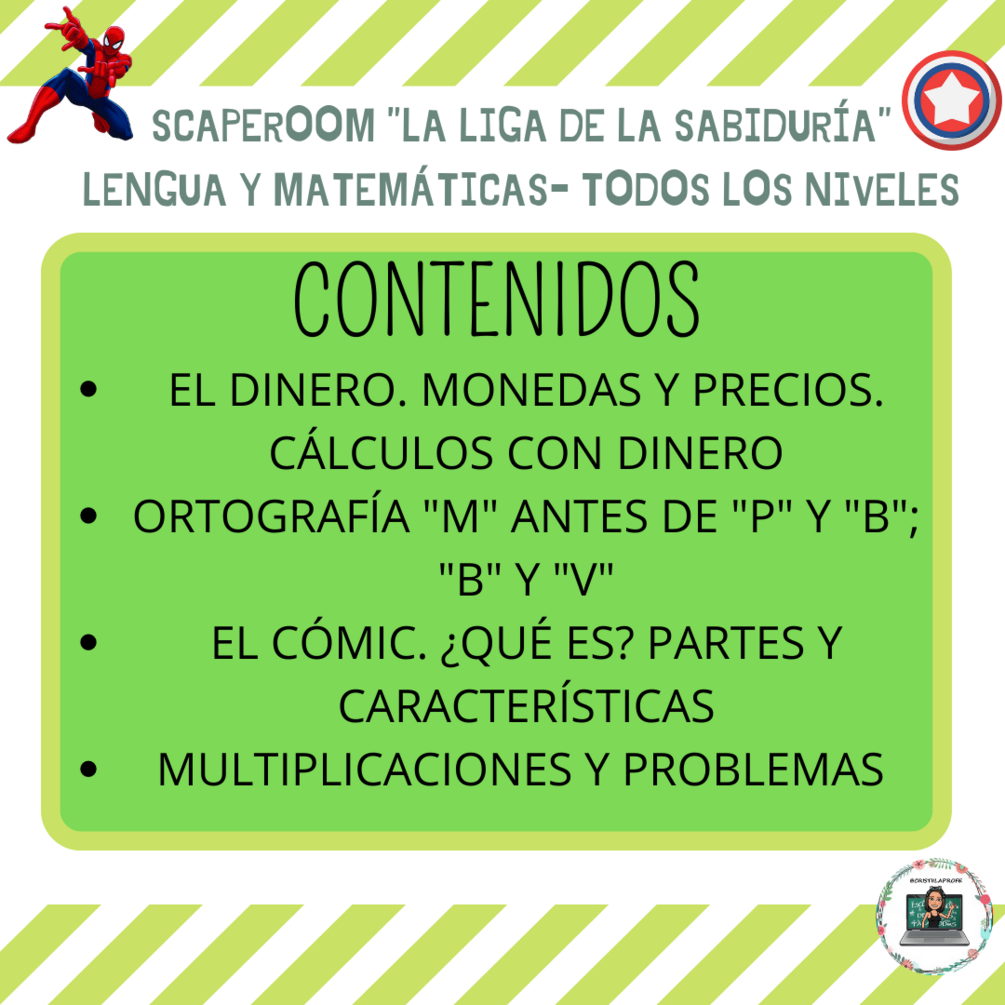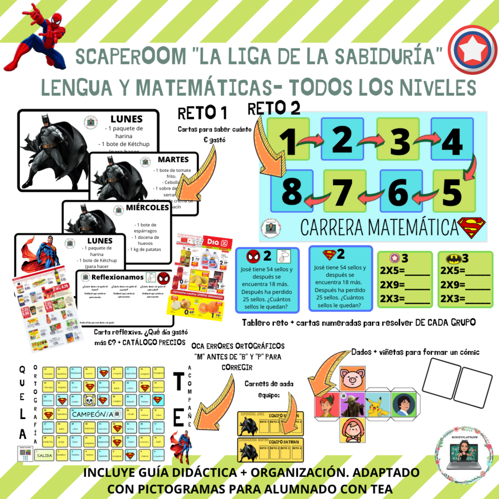 🦸SCAPEROOM "LA LIGA DE LA SABIDURÍA" MATEMÁTICAS Y LENGUA- Realizado en 2ºEd. Primaria, pero adaptable a cualquier curso🦸♂️ ORGANIZACIÓN. El alumnado se distribuye en 4 grupos de 6 alumn@s. Cada niñ@ tiene su CARNET desde el primer momento, donde están todos los retos que tienen que superar para finalizar las pruebas. *Cada grupo era un SUPERHÉROE: Batman, Superman, C. América y Spiderman. 🟠¿QUÉ INCLUYE EL PACK? ↪️RETOS RETO 1. ¿CUÁNTO DINERO HA GASTADO MI SUPERHÉROE? Cada grupo recibe 3 cartas de su superhéroe respectivamente. En la carta, se indica lo que ha comprado el lunes, el martes y el miércoles. Tendrán que buscar en el catálogo de precios (que también se incluye? cuánto vale cada cosa y calcular cuánto gastó en total cada día. Finalmente, hay una tarjeta de REFLEXIÓN donde se deja espacio para realizar las operaciones y por otro lado, rodear el día que gastó más dinero. RETO 2. CARRERA MATEMÁTICA. Inlcuye 1 tablero de juego para cada equipo, indicado con el escudo de su superhéroe. El tablero numerado del 1-8, donde deben ir tachando qué cartas resuelven. Incluye también 8 cartas por cada grupo: 4 con problemas y 4 con multiplicaciones variadas. RETO 3. OCA "M" ANTES DE "P" Y "B". Oca ortográfica para corregir en el tablero qué palabras están mal escritas. Hasta que no estén todas bien no podremos jugar al juego de la Oca. Hay algunas palabras que están bien. RETO 4. DADO + VIÑETA. Dados para cada grupo con personajes típicos. Tras explicar qué era un cómic y qué partes tenía, debían elaborar una viñeta con el personaje que les hubiera salido en el dado e incorporar uno de sus elementos característicos: el bocadillo. ↪️CARNETS. Incluye carnets de los 4 equipos sin nombres para imprimir y escribir el nombre del alumnado. ↪️GUÍA DIDÁCTICA. Para guiarte y comprender mejor la metodología y actividades. 🔵TODOS LOS MATERIALES ESTÁN ADAPTADOS CON PICTOGRAMAS DE @arasaac para facilitar el trabajo al alumnado NEAE🔵