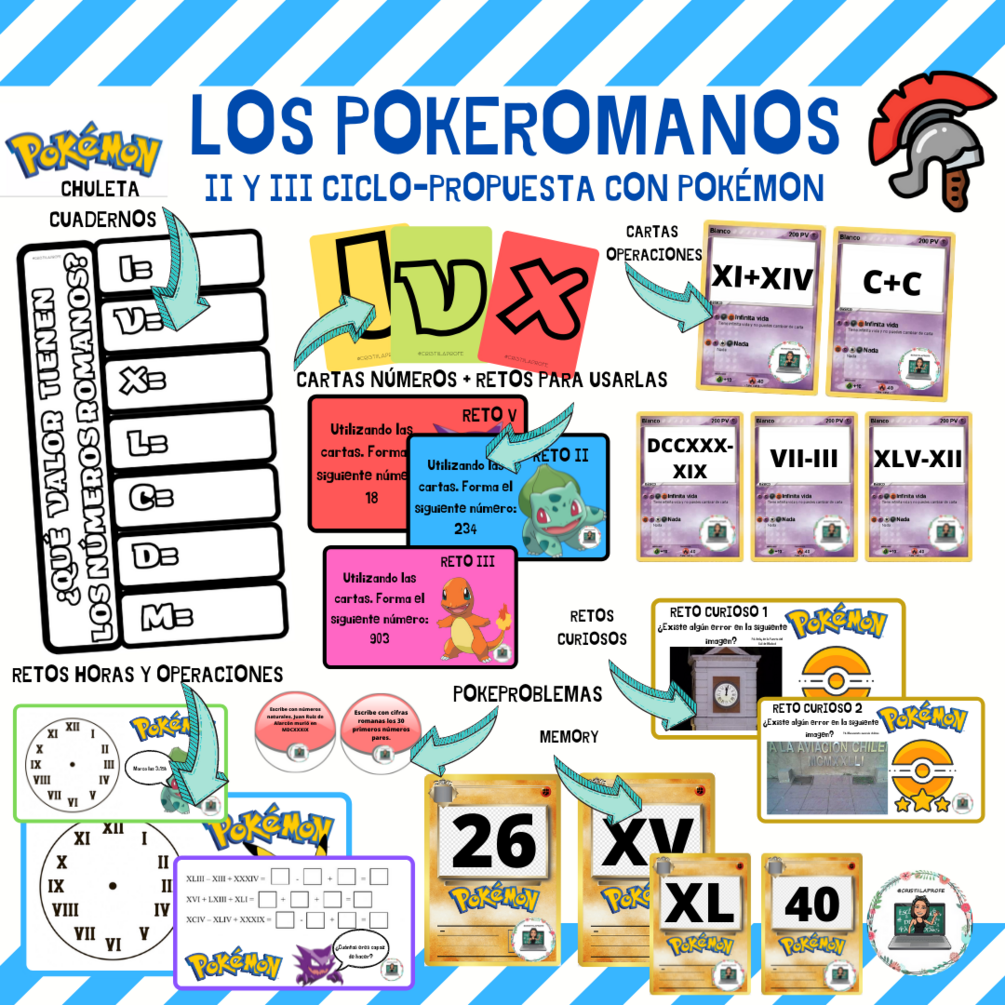 En el día de hoy os traigo una nueva propuesta para LOS NÚMEROS ROMANOS en el II y III Ciclo de la Ed. Primaria. Está realizado y diseñado con la temática de Pokémon y contiene varios recursos: 1. PLEGABLE PARA CUADERNOS. Para apoyar a tu alumnado y hacer más visible y poder utilizarlo durante sus actividades y estudio. Deben completar con el número natural. 2. RETOS HORAS Y OPERACIONES. Es individual o grupal. Diversos retos para trabajar el reloj con números romanos y operaciones combinadas. 3. JUEGO MEMORY. Típico juego. Baraja de cartas con números romanos y números naturales. El alumnado intenta coger, mientras las cartas están dadas la vuelta, las cartas que son iguales (mismo número). 4. RETOS CURIOSOS. Con diferentes retos para pensar sobre errores reales cotidianos de los números romanos, así como pensar para qué se utilizan en la actualidad. 5. BARAJA DE CARTAS OPERACIONES. Baraja de cartas con operaciones: suma, resta y multiplicación. Libre uso de juego. 5. BARAJA DE CARTAS OPERACIONES. Baraja de cartas con operaciones: suma, resta y multiplicación. 6. RETOS PARA TRABAJAR CON LA BARAJA DE CARTAS DE COLORES. CADA Nº ROMANO TIENE UN COLOR Y SE DEBEN REALIZAR LOS RETOS QUE SE PROPONEN CON ESAS MISMAS CARTAS. 7. POKEPROBLEMAS. Incluye comparación de numeración romana.