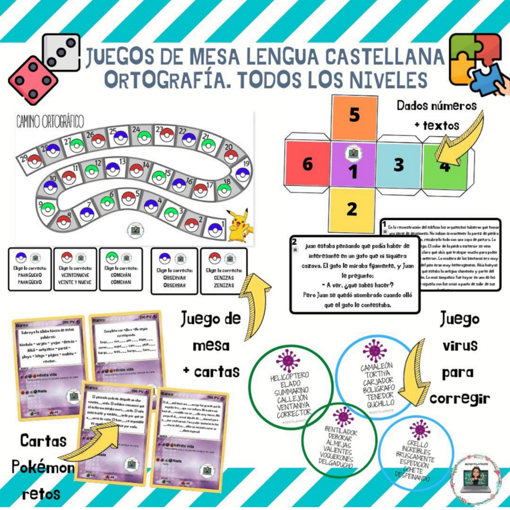 En el día de hoy os traigo una nueva propuesta para trabajar la #ortografia en todos los niveles con el alumnado en el área de #lenguacastellanayliteratura Algunos juegos tienen temática #pokemon ✅1. JUEGO DE CARTAS + TABLERO. Se juega por parejas o por 2 grupos. Un equipo, coge una carta y lanza un dado. Tiene que avanzar las casillas indicadas y coger una carta del mismo color de la pokeball del tablero. Resuelve. Si lo acierta, puede tirar, si no, se quedará ahí hasta que lo resuelva. Gana el equipo que cuando se hayan acabado las cartas, tenga más pokeballs. ✅2. JUEGO CARTAS POKÉMON . Los niñ@s de forma individual o colectiva, tienen que jugar. Se ponen todas las cartas bocabajo y cogen una. Resuelven el reto que les toque. Si lo hacen bien (un niñ@ puede actuar de jurado y corregir) pueden quedarse la carta y seguir. GANA EL GRUPO/ NIÑ@ que más cartas tenga al finalizar el juego (quedarse sin cartas bocabajo)🔵 ✅ 3.DADOS NUMEROSOS Y TEXTOS. Un alumn@ o grupo tira el dado y obtiene un número del 1-6. Hay 6 textos numerados. Debe coger el texto que indique el número que ha salido en el dado y corregir los errores ortográficos que se indican en el mismo. El niño puede contar con 20 oria y por cada falta (un niñ@ jurado o el contrincante corrige) se resta 1 pto. Gana el alumn@ que más puntos tenga tras restar todo y se hayan acabado de hacer todos los textos. ✅4. JUEGO VIRUS. Se juega de modo individual. Todas las tarjetas se ponen bocabajo y a la de 3 se dice ¡VIRUS! Cada niñ@ coge una carta aleatoria y tiene que encontrar y corregir los errores que haya. Al finalizar debe volver a decir ¡VIRUS! Gana el alumn@ que antes acabe y haya encontrado todos los errores.