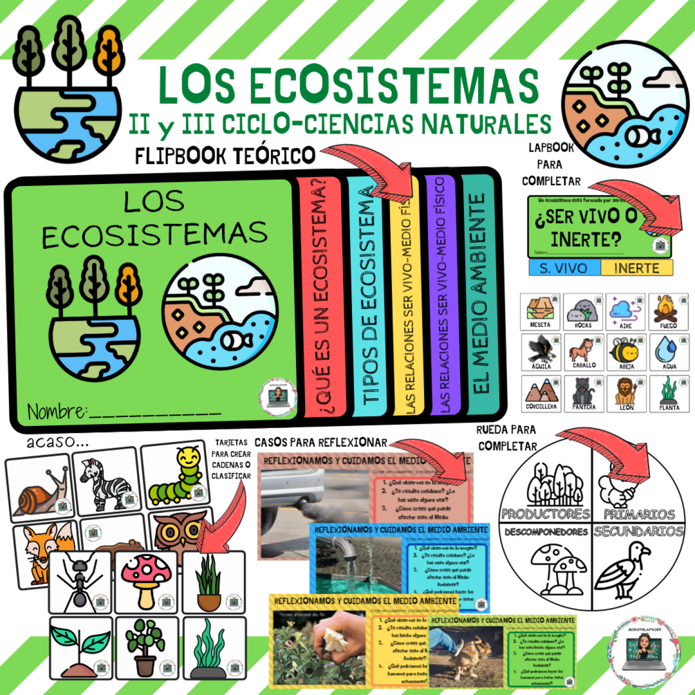 Hoy os quería enseñar este nuevo material que he creado para trabajar los contenidos de Ciencias Naturales relacionados con #losecosistemas en el II y III Ciclo de la #educacionprimaria. El pack consta de varios recursos: 1. 🏞FLIPBOOK TEÓRICO. Visual, con imágenes y palabras subrayadas con el fin de aportar contenidos visuales al alumnado y que puedan apoyarse en él durante las actividades y estudio. 2. 🏞PACK JUEGO DE CARTAS. Cartas de diferentes animales + conjunto de flechas. Ideal para clasificar animales en función de: productores, primarios, secundarios o descomponedores. También se pueden utilizar para crear cadenas alimentarias. 3. 🏞RUEDA PRODUCTORES, PRIMARIOS, SECUNDARIOS Y DESCOMPONEDORES. Para colorear, recortar y completar la definición 4. 🏞CASOS PARA REFLEXIONAR. Flashcard con acciones perjudiciales para el Medio Ambiente. Los alumn@s deben coger una y contestar las preguntas en su cuaderno describiendo lo que ven en la imagen. 5. 🏞LAPBOOK PARA COMPLETAR CON RECORTABLES. ¿Qué conforma un ECOSISTEMA? Seres vivos+ materia inerte. Se proponen unas pequeñas tarjetas. Deben recortarse y clasificarse en estos dos tipos.