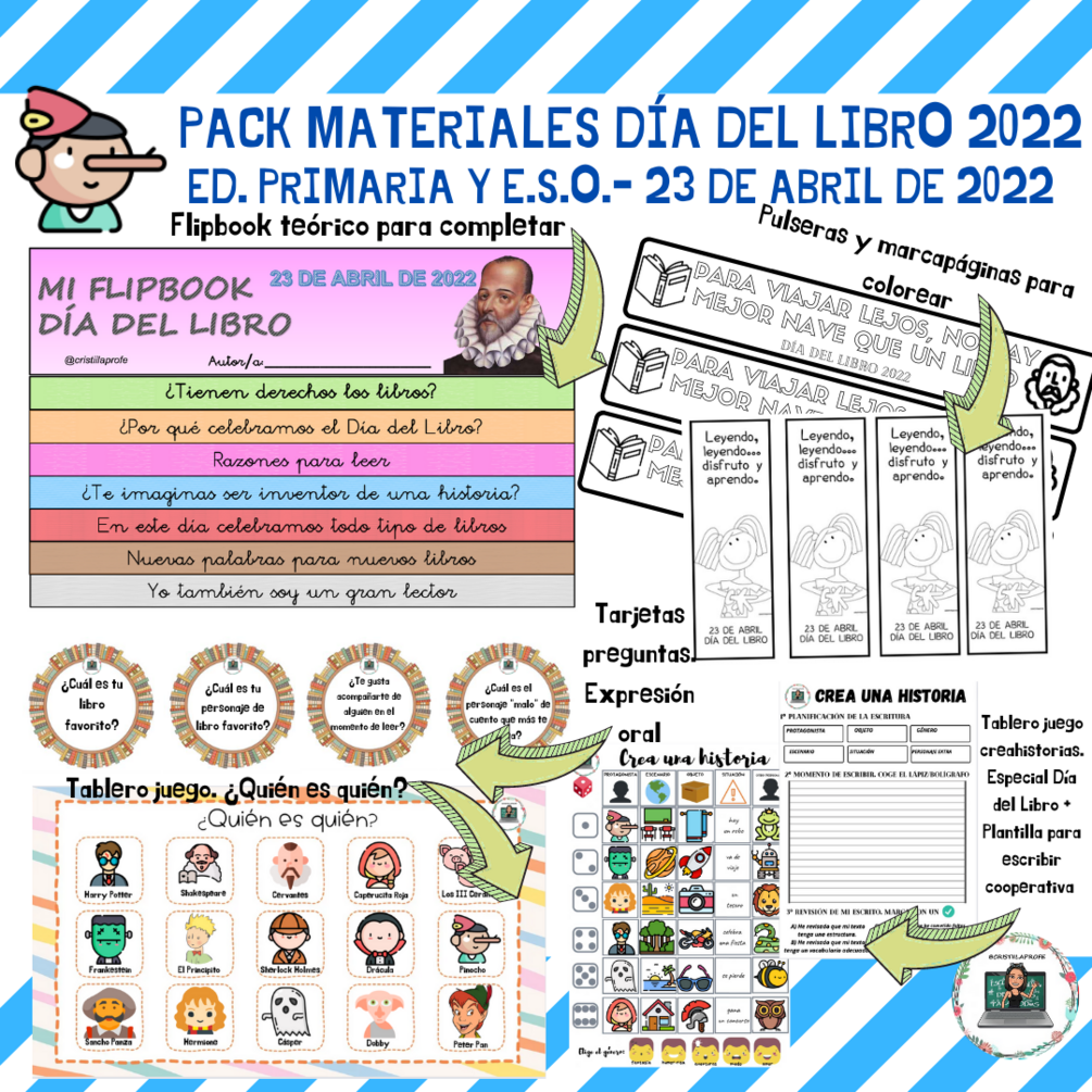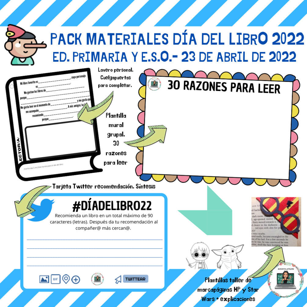 ¡Buenas tardes #claustrodeigprimaria #claustrodeigeso ! En el día de hoy, os traigo un nuevo pack de materiales para trabajar el #diadellibroenelcole Contiene varios recursos variados: 📒1. FLIPBOOK. Teórico sobre conceptos básicos y opinión del Día del Libro. Es para completarlo. 📔2. PULSERAS Y MARCAPÁGINAS. Para colorear y (las pulseras), montarlas para encajarlas en la muñeca del alumnado. 📕3. TARJETAS EXPRESIÓN ORAL. Tarjetas con preguntas para trabajar la expresión oral. Ideales para jugar en grupo/parejas o generar debate en el aula para "romper el hielo". 📘4. TABLERO JUEGO QUIÉN ES QUIÉN. Típico juego de mesa "quién es quién" con temática literaria y de autores característicos del 23 de ABRIL. 📗5. TABLERO JUEGO CREAHISTORIAS. Incluye la plantilla para tirar los dados y la plantilla de escritura. Se atiende al proceso de escritura: PLANIFICACIÓN (deben escribir qué les ha tocado al tirar el dado), ESCRITURA (con espacio de pauta) y REVISIÓN (con preguntas para revisar y colocar un tick). 📒6. LLAVERO LIBRO. Para decorar, completar con información propia. - EN EL CUADRADO, REALIZAR UN DIBUJO. - EN EL LOMO, COMPLETAR CON SU NOMBRE. ¡OJO! El círculo que tiene en el lomo es para recortar y colocar un trocito de lana. Así, creamos un llavero o un cuelga-puertas. - En la parte baja, espacio reservado para escribir una frase con motivo del Día del Libro. 📘7. MURAL 3O RAZONES PARA LEER. Por grupos cooperativos, individual o toda la clase, pueden realizar un mural con 30 razones por las que leer. 8. TARJETA TWITTER. Para recomendar al compañero de al lado, en frente o detrás (cada alumn@ recomienda a otro (no aleatorio, para que nadie se quede sin tarjeta). En la tarjeta, con un máximo de 90 caracteres, deben recomendar un libro. 9. TALLER DE MARCAPÁGINAS HP Y STAR WARS. Incluye plantillas e instrucciones.