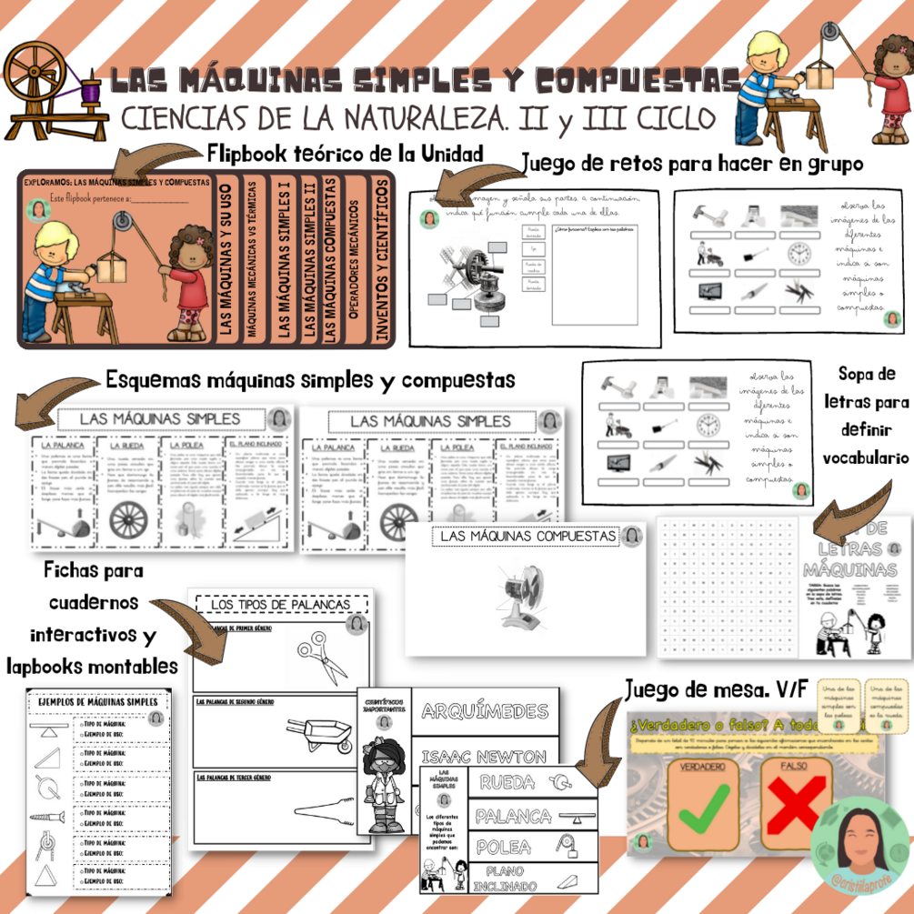 📹📞ᒪᗩᔕ ᗰÁᑫᑌIᑎᗩᔕ ᔕIᗰᑭᒪEᔕ Y ᑕOᗰᑭᑌEᔕTᗩᔕ. ᑕIEᑎᑕIᗩᔕ ᗪE ᒪᗩ ᑎᗩTᑌᖇᗩᒪEᘔᗩ EᗪᑌᑕᗩᑕIÓᑎ ᑭᖇIᗰᗩᖇIᗩ 📷🗜 ¡Buenos días #claustrodeigprimaria! En el día de hoy os traigo un nuevo material para trabajar LAS MÁQUINAS SIMPLES Y COMPUESTAS en el área de Ciencias de la Naturaleza. El pack contiene los siguientes materiales: 1- Flipbook teórico. Para acompañar al alumnado durante las actividades y estudio de la Unidad. Viene con las palabras más importantes en color resaltante y con imágenes significativas. Se incluye en color y a blanco y negro. 2- Esquemas de la Unidad de las máquinas simples y compuestas. Teóricos y mudos con espacios para completar huecos (a modo de esquema) 3- Fichas para cuadernos interactivos. Para practicar partes del las máquinas compuestas, ejemplos de uso de las máquinas simples, las palancas y sus géneros + DOS LAPOOKS MONTABLES: Uno de los científicos más importantes y otro de las máquinas simples para definir debajo. 4- SOPA DE LETRAS. Para buscar las palabras más importantes de la Unidad y definirlas en el cuaderno. 5- RETOS COLABORATIVOS GRUPALES. Son diferentes retos en blanco y negro para trabajar de manera grupal los contenidos de la Unidad. Lo ideal es plastificarlos y darles un uso reutilizado con los rotuladores borrables. 6- JUEGO DE MESA. A TOMA MÁQUINA. Se jugará por pequeños grupos de alumnos/as. Cada grupo encontrará un tablón de juego y una baraja de cartas (ambas cosas se incluyen en el pack). La idea es que el alumnado lea las afirmaciones de las cartas y decida si son verdaderas (V) o falsas (F). Deben dialogar y decidir entre los equipos y colocar la carta en el montón del tablero correspondiente. Lo ideal es jugar en 10 minutos de tiempo (normas incluidas en el tablero) y el equipo que antes clasifique las cartas correctamente en V/F será el ganador.