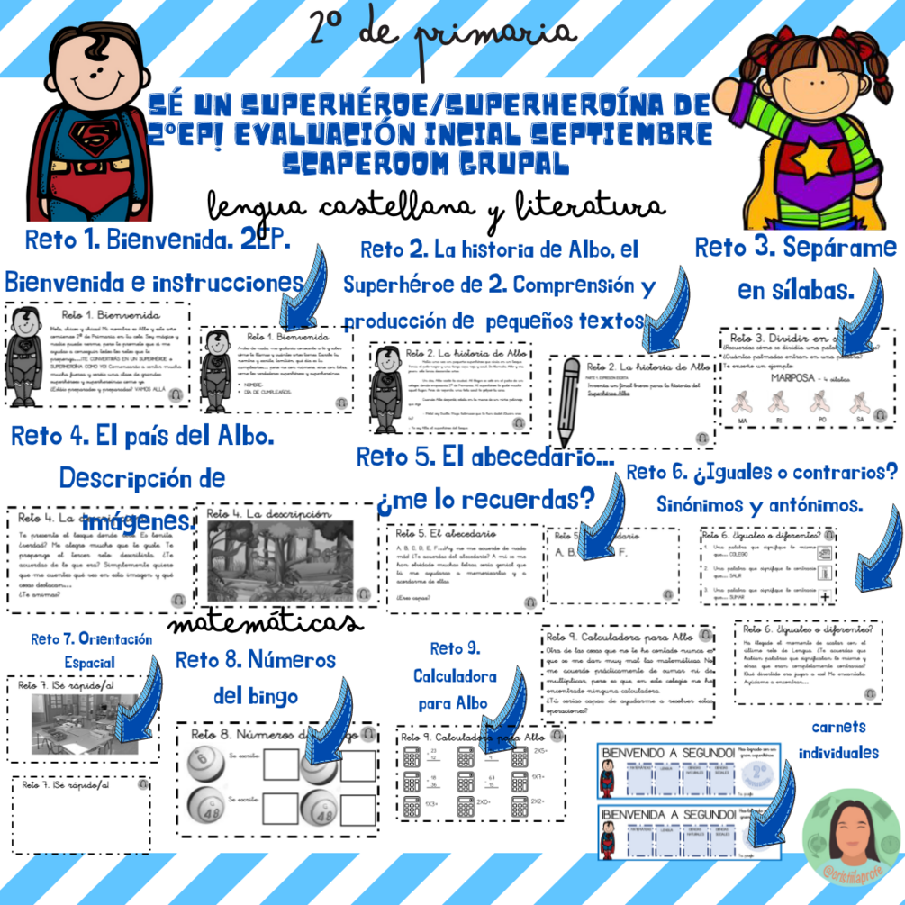 EᐯᗩᒪᑌᗩᑕIÓᑎ IᑎIᑕIᗩᒪ 2º ᑭᖇIᗰᗩᖇIᗩ. ᔕᑕᗩᑭEᖇOOᗰ ᔕᑌᑭEᖇᕼÉᖇOEᔕ Y ᔕᑌᑭEᖇᕼEᖇOÍᑎᗩᔕ 🦸♂️ ¡Continuamos con la saga #evaluacionesinicialesparaprimaria #claustrodeigprimaria! Os presento el SCAPEROOM PARA 2º PRIMARIA "NUESTRO AMIGO ALBO" ✅Albo es un superhéroe que viene de un bosque precioso a 2º de Primaria del cole. Necesita aprender todo lo que aprendimos en 1º, porque en el bosque donde vivía no había cole. ¿Lo ayudamos? IMPORTANTE: Los retos pueden hacerse por grupos o por individual. TODOS LOS RETOS VIENEN CON INSTRUCCIONES PARA EL ALUMNADO Y UN CARNET INDIVIDUAL DONDE IREMOS SELLANDO AL ALUMNADO LOS RETOS SUPERADOS (así damos también un toque de motivación e incertidumbre) RETO 1. BIENVENIDA E INSTRUCCIONES. Para que el alumnado coja confianza con el Scaperoom y trabaje en base a sus datos personales. RETO 2. LA HISTORIA DE ALBO. Se propone una lectura y dos retos, uno relacionado con la comprensión lectora y otro con expresión escrita para inventar un final breve a la historia RETO 3. SEPÁRAME EN SÍLABAS. Se propone un ejemplo con palmadas. Se da al alumnado 5 palabras para dividir en palmas o sílabas y saber cuántas tiene. RETO 4. EL PAÍS DEL ALBO. Aparece una imagen del bosque donde vivía antes de llegar al colegio. El alumnado debe describir y contar qué podemos encontrar en esa imagen del bosque de Albo. RETO 5- EL ABECEDARIO. Albo ha olvidado todo el abecedario a partir de la "F". Se propone una plantilla para que el alumnado escriba las letras que la siguen. RETO 6- Retos para proponer palabras sinónimas y contrarias. Apoyado en imágenes. RETO 7. ORIENTACIÓN ESPACIAL. Retos para trabajar conceptos de orientación espacial. RETO 8. NÚMEROS DEL BINGO. Para escribir con letra y proponer el número anterior y posterior a indicado. RETO 9. Operaciones divertidas (sumas y letras de nº de 2 cifras y tabla del 1,2,0 y 5)