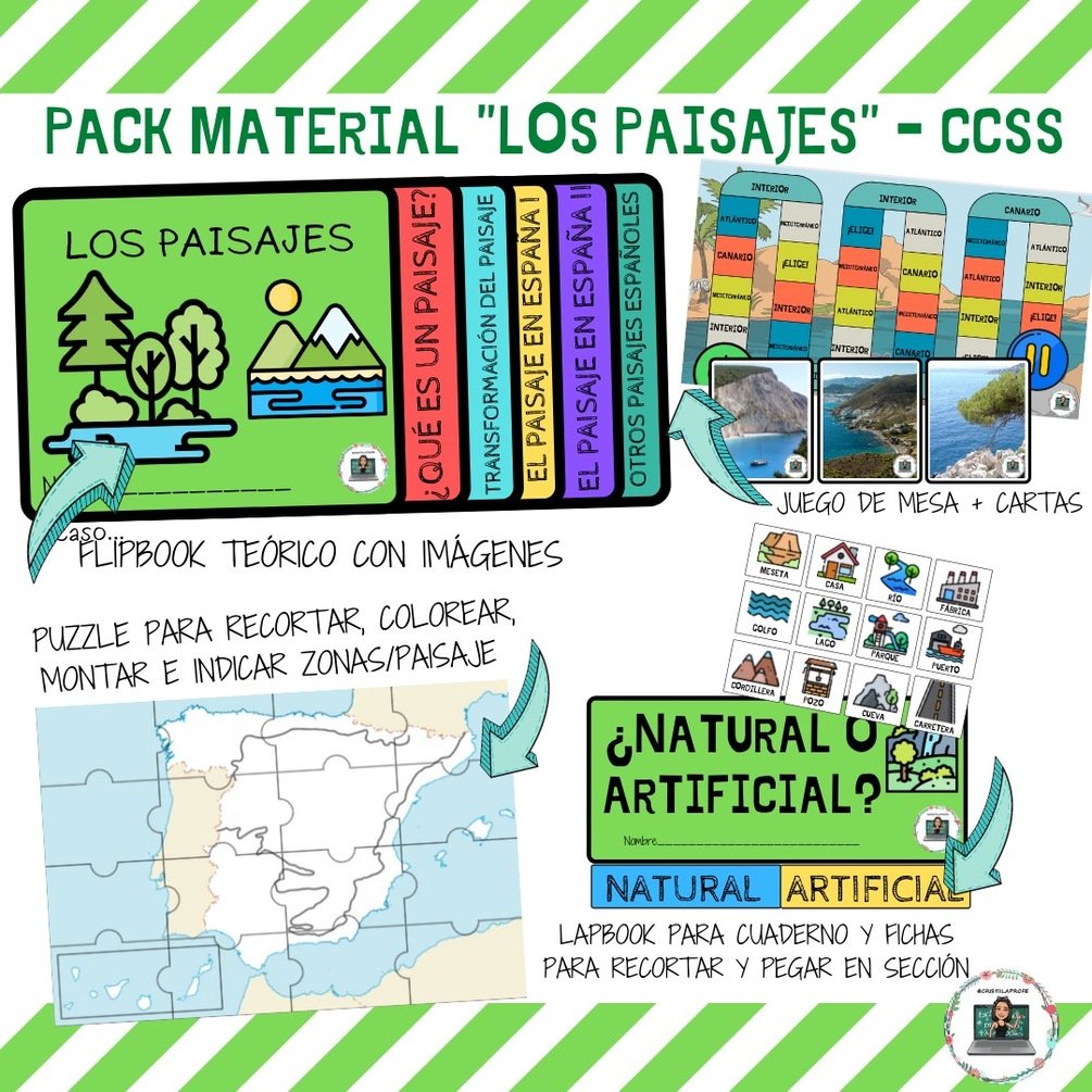 ¡Buenas tardes #claustrodeigprimaria! 🎲 Hoy es traigo un nuevo material para desarrollar en vuestras clases de Ciencias Sociales y trabajar #lospaisajes 🌏 El pack contiene un total de 4 materiales: 1. MATERIAL FLIPBOOK TEÓRICO. Para información teórica visual y sencilla para tu alumnado. Se apoyarán en él para realizar actividades y estudiar. 2. PUZZLE MAPA ESPAÑA. Para colorear, recortar, formar en el cuaderno e indicar zonas de paisajes españoles. 3. LAPBOOK EJEMPLOS NATURAL VS ARTIFICIAL. Lapbook en blanco para recortar las fichas e ir pegándolas. 4. JUEGO DE MESA. Incluye tablero y cartas para jugar. ¿Cómo se juega? Se establece el tablero y los alumnos con un dado, deben la lanzar y posicionarse en la casilla que les haya tocado. Dependiendo de lo que ponga, tienen que escoger una carta de ese tipo de paisaje.
